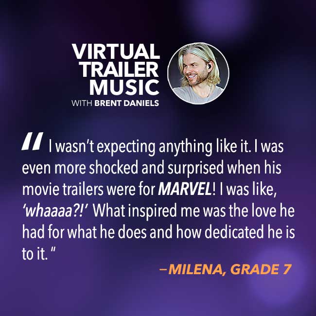 The Virtual Trailer Music workshop is as one-of-a-kind, inspirational experience! During this deep dive, students learn how their everyday devices are used by professionals like Brent to create the music and sounds they hear everyday in blockbuster movie, TV and video game trailers.