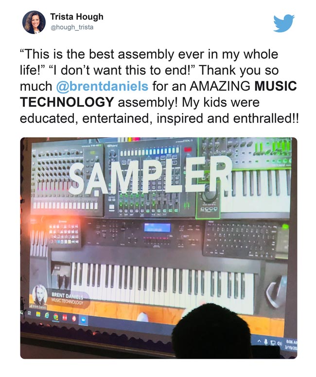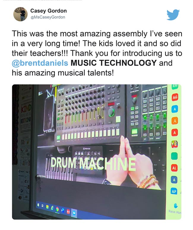 A passionate advocate for education, Brent uses his Virtual Music Technology assembly as a vehicle for delivering an important message: a student's education, great study habits and positive decision-making are essential for their success in all aspects of life.
